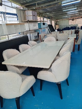 This elegant 6-seater dining set features a sleek marble-top table paired with six plush, high-back chairs for a refined yet comfortable dining experience. The glossy marble finish adds a luxurious touch and is easy to clean, making it perfect for both everyday meals and special gatherings. The wood Used for the footers is Blue gum which is a hardwood.