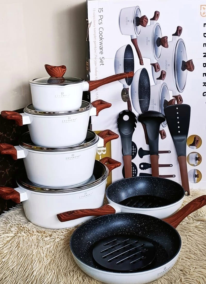 The Edenberg 15-Piece Non-Stick Cookware Set offers everything you need for everyday cooking. Made from high-quality aluminium with a marble coating, it ensures fast, even heating and effortless food release. Includes pots, pans, lids, and utensils for versatile kitchen use.