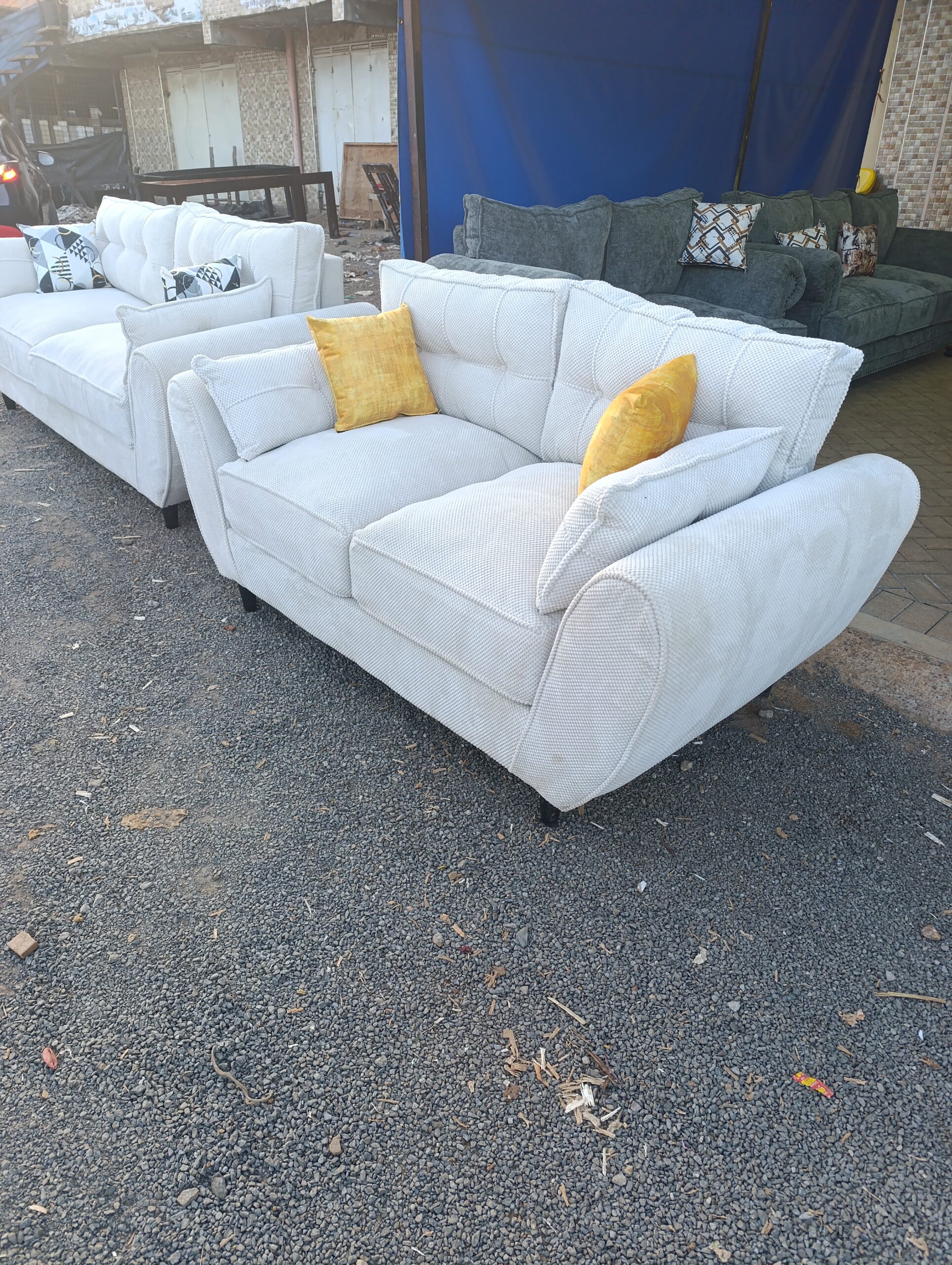 This sofa set includes a 2-seater and 3-seater combination, both upholstered in a beige textured fabric with a soft, durable finish. The seats and backrests are designed with deep tufting and spring cushions, offering excellent comfort and shape retention over time.